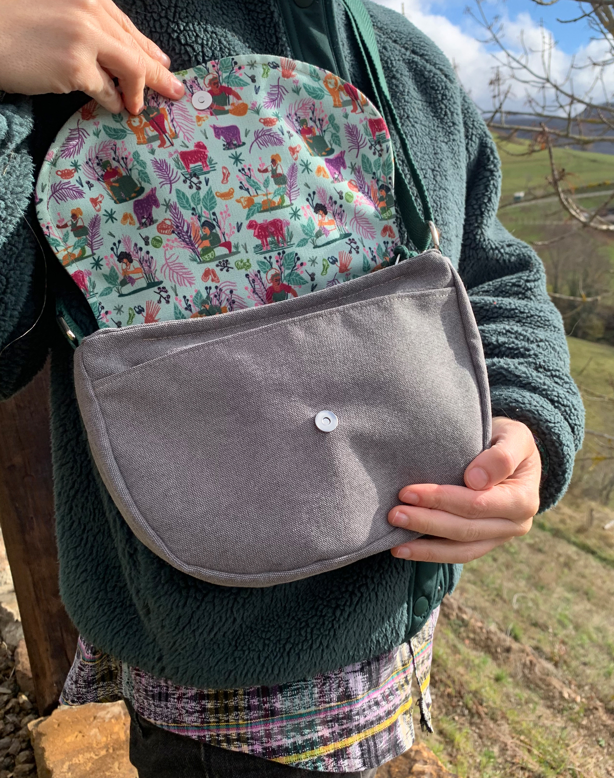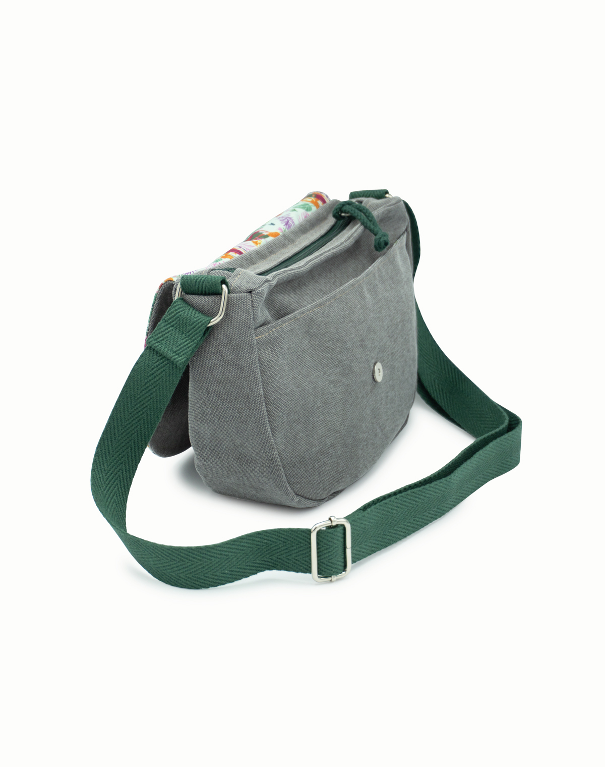 Su compartimento principal tiene un bolsillo interior y se cierra con cremallera, pero además tiene un bolsillo frontal para lo que quieras llevar más a mano. Su solapa queda perfectamente colocada gracias a un broche de imán, y su asa se regula para que puedas llevarlo al hombro, como bandolera, o incluso ajustado a la cintura.