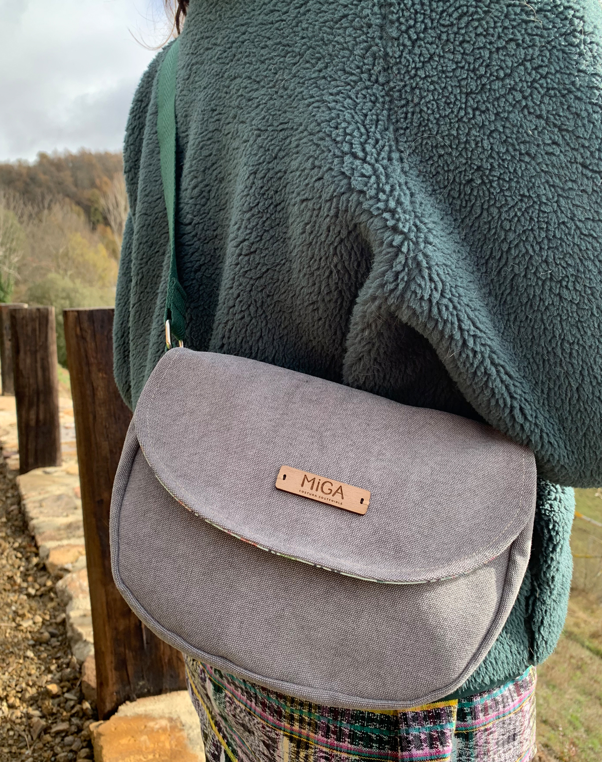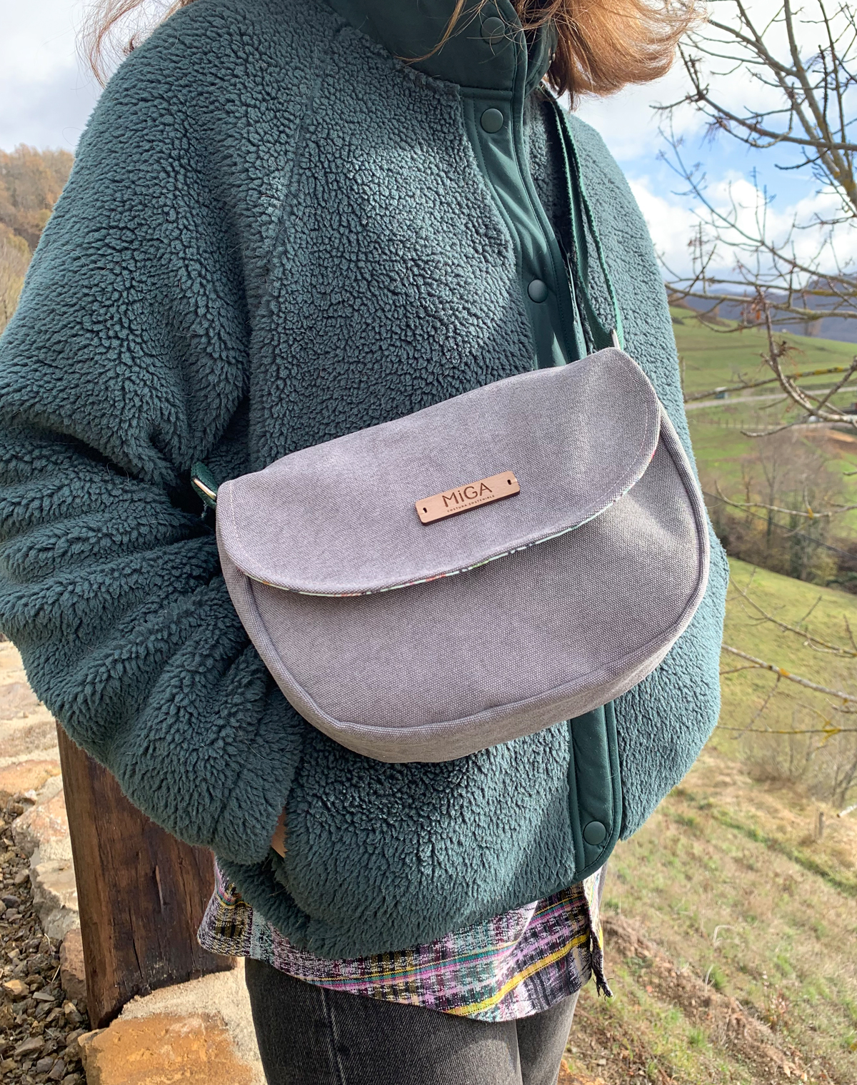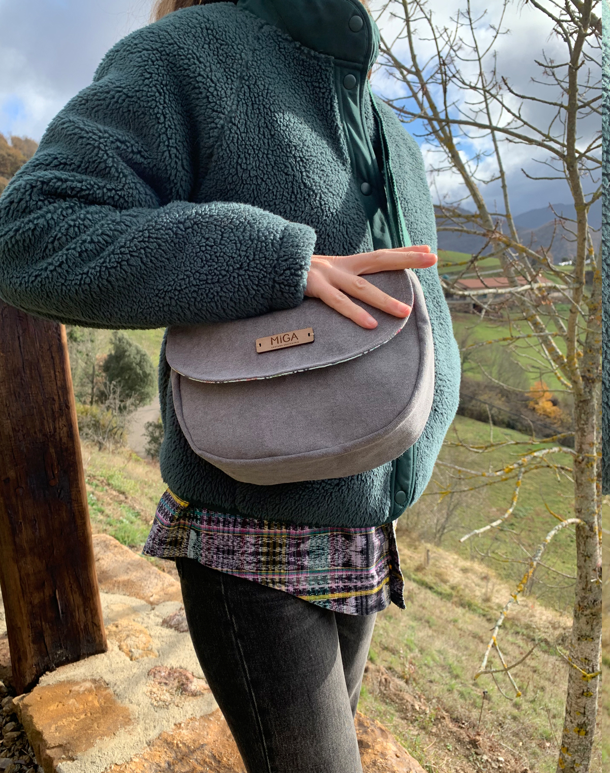 Este modelo en color liso es un básico que combina con todo, y en su interior lleva el estampado Mujeres Lebaniegas, un homenaje a las mujeres que me rodean y de las que desciendo, a las que nacieron aquí y a las que llegamos después. Está dedicado a estas, a sus diferentes oficios y a los saberes tradicionales de nuestro Valle.